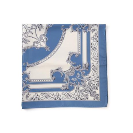 アラベスク柄の大判スカーフ。首やヘッドアクセサリーのように頭に巻いたり、バッグのハンドルに結ぶなど、コーディネートのアクセントにぴったりです。シーズンレスで取り入れやすいのも嬉しいポイント。柔らかい色味のグレーとブルーの2色展開です。※モデルの着用画像の場合、光の当たり具合により、実際の色味と異なって見えることがございます。色味は、商品単体の画像をご参照ください。