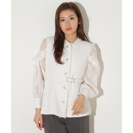 ツイード素材がエレガントなジレ。トレンド感のあるツイード素材のジレは、一枚羽織るだけでぱっと華やかな印象に。ボウタイブラウスと合わせてきちんと感のあるコーデ、シンプルなリブニットと合わせて上品カジュアルなコーデもオススメ。フレアパンツやチュールスカートなど・・スタイリングの幅が広く着回せます。付属のベルトでウエストマークが出来るので、メリハリのあるシルエットが叶います。※撮影時照明の関係により、色味が違って見える場合がございます。またパソコン・スマートフォンなどの環境により、若干製品と画像のカラーが異なる場合もございます。予めご了承ください。商品の色味は、商品単品画像をご参照下さい。※商品画像はサンプルのため、色味やサイズ等の仕様に変更がある場合がございますので、予めご了承ください。