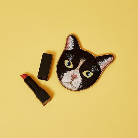 インド特有の色鮮やかなビーズ刺繍が施された、ネコのモチーフのミラー。
