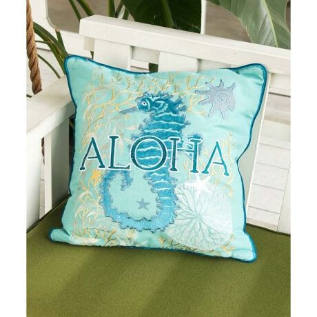 [型番:4CEP5104-2025]刺しゅうやアップリケなど様々なテクニックが散りばめられたクッションカバー。海の雰囲気を感じられるシーホースが目を惹くデザイン。大きめなファスナーで出し入れも楽にできます。※中身のクッションは付いておりません。