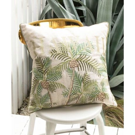 [型番:4CEP5101-2025]繊細な刺しゅうが施されたクッションカバー。南国の空気を感じられるパームツリーがポイント。大きめなファスナーで出し入れも楽にできます。※中身のクッションは付いておりません。