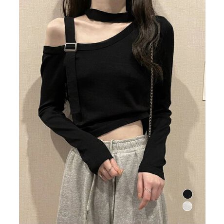 チョーカー風 無地 薄手 肩出しトップス