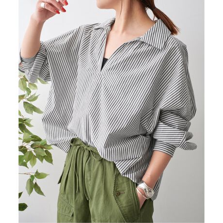 スッキリとしたキーネックのえり元と、繊細なギャザーとたっぷりした分量感、立体的なパターンメイキングが印象的なシャツ。