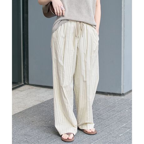 やわらかな色味でこなれ感のある細めのストライプ素材を使ったラフな印象のイージーパンツ。