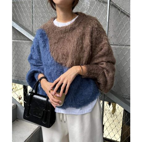 配色 シャギー 起毛 ショート丈 ニット トップス