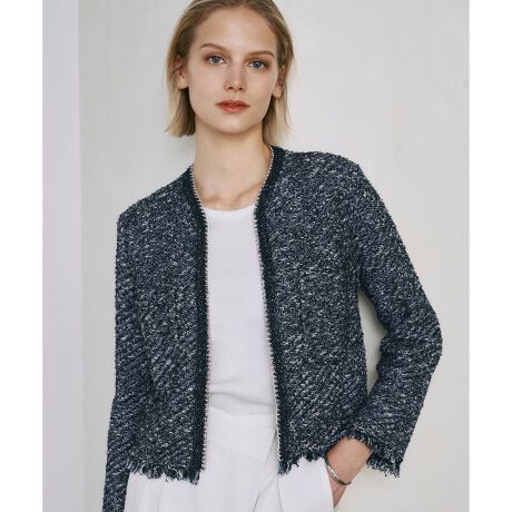 ■デザインショートレングスのデニムライクなニットツイードジャケットです。様々な種類と色のファンシーヤーンをミックスし綾目調に編み立て、糸のコントラストを楽しめる存在感のあるアイテム。チェーンを編み込んだかぎ針のトリミングや3種の糸のフリンジテープを付け、ぐっときらめきと華やかさをプラス。共地の大きめポケットもポイントになっています。レトロモダンな中にきりっとした印象があるので、ボリューム感のあるボトムと合わせこなれた雰囲気で着こなしていただくのもおすすめです。