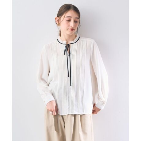 ピンタックと配色リボンをアクセントにしたきれいめブラウス。