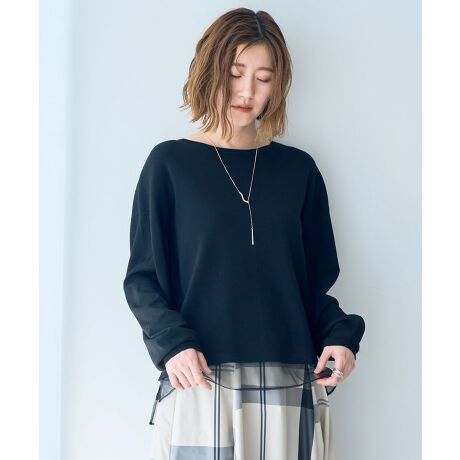 ハイゲージ編みのきれいめニットにオーガンジー素材で切り替えた裾のデザインがおしゃれな1着です。