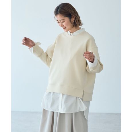 幅のあるラウンドネックや落ち感のあるスリーブ、サイドヘムにはスリット入りでこなれ感たっぷり。
