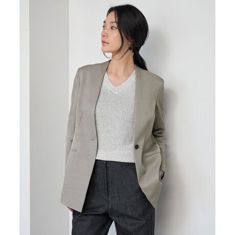 ■デザインバックスリットデザインがポイントのノーカラージャケットです。一つ釦でスッキリ上品な印象ですが、後ろにラップ風スリットを効かせ、適度に抜け感のあるアイテムに仕上がっています。