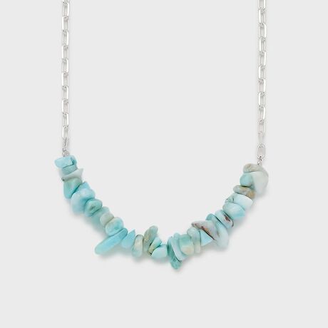ラリマーの爽やかで優しい色合いが目を引くネックレス。一つひとつ形が異なるさざれ石のラリマーにシルバーチェーンを合わせ、ラフな印象に。Tシャツの襟元に合わせやすいよう45cmに仕立てています。※天然石や天然素材を使用しているものは、サイズ・色味・風合いの違いや、若干の傷、内包物の有無などに個体差があります。予めご了承ください。