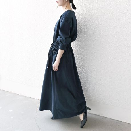 ウエストに施したテープベルトがスポーティーな雰囲気のロングワンピース。