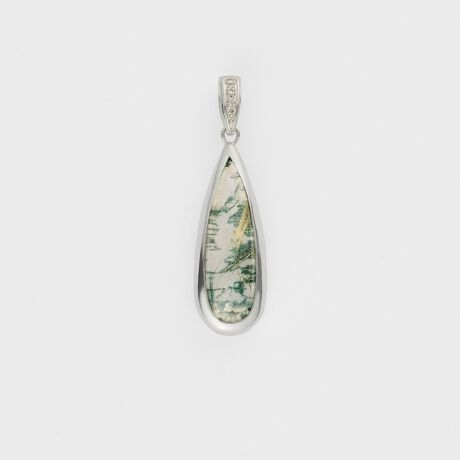 グリーンモスアゲートの上にルチルクォーツを重ねた、新作ダブレットストーンのネックレスチャームです。ひとつひとつ異なるモスアゲートの表情を楽しんでいただけるよう、石座に大きく光穴を設けてシンプルな覆輪留めで仕上げています。バチカンに並ぶ繊細なダイヤモンドの輝きが、モスアゲートの艶やかな質感を一層引き立てています。グリーンモスアゲートは“癒しの石”といわれ、優しさを呼び起こしネガティブな感情を落ち着かせてくれると言われています。縦長のしずく型が胸元をすっきりとシックにみせてくれ、コーディネートしやすくモダンな印象を叶えます。※天然石や天然素材を使用しているものは、サイズ・色味・風合いの違いや、若干の傷、内包物の有無などに個体差があります。予めご了承ください。
