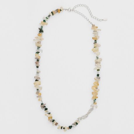 砂粒のような原石の雰囲気を残した、アースカラーのラフな天然石をランダムに配したネックレス。一部をシルバーチェーンに切り替えることで、抜け感をプラスしています。アジャスターが10あるので、襟の形状に合わせて長さを調整でき、スタイリングの幅が広がります。※天然石や天然素材を使用しているものは、サイズ・色味・風合いの違いや、若干の傷、内包物の有無などに個体差があります。予めご了承ください。