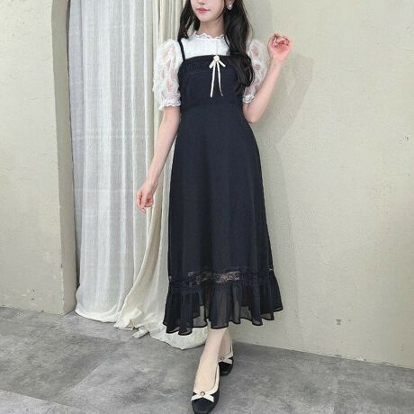 柔らかなジョーゼット素材に、ほんのり透け感のある裾のレースラインが軽やかなアクセントに。