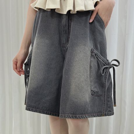 【洗える】ドロスト リボン デニム ハーフパンツ