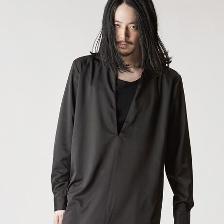 上質な素材感と洗練されたデザインが特徴のスキッパーロングシャツ。深いVゾーンとロングシルエットがスタイリッシュな印象を与える一着です。