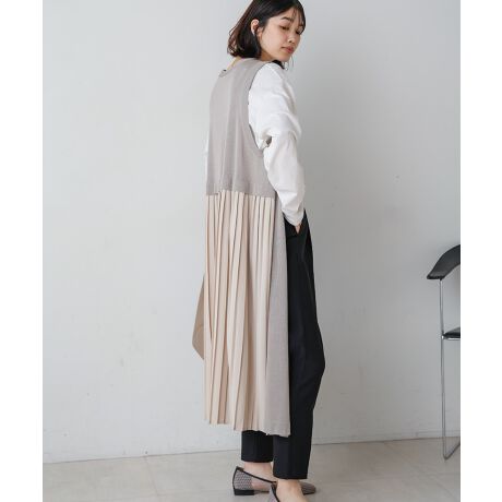 ニットと布帛を組み合わせたハイブリッド型のロングジレ。特徴的なのは、脇から後ろにかけて施されたプリーツ加工。動くたびに軽やかに揺れ、どこから見ても美しいシルエットを作り出します。縦長のラインがスタイルを引き立て、すっきりとした印象を与えてくれるので、シンプルなコーディネートでも、存在感が抜群です。