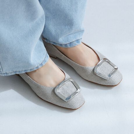 メタリックバックルがローヒールながら足元を華やかに見せてくれます。
