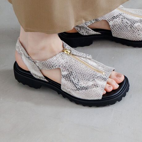 足をしっかりと覆うデザインのため、ソックス合わせなどで晩夏まで長く履いていただけます。26SSではパイソン柄のグレー/Cが新色で登場!