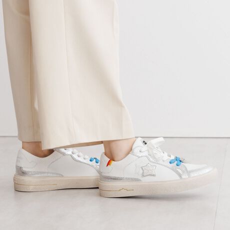 大人の女性にふさわしいハイエンドなスニーカーは、遊び心の効いたカラーリングとアイコニックな3連スターのパッチがポイント。