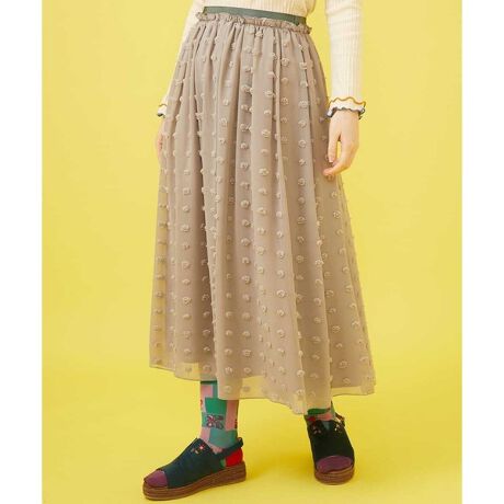 同配色のドットドビーが大人かわいいギャザースカート。シフォンのたっぷりボリューム感のあるギャザースカートは、春らしい軽やかな印象に。オールゴムウエストでリラクシーな着用感も嬉しいポイントです。ウエストのグログランゴムとフリルがデザインのこだわりポイントに。