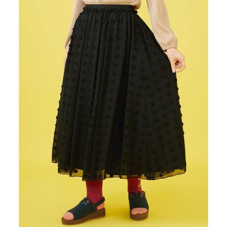 同配色のドットドビーが大人かわいいギャザースカート。シフォンのたっぷりボリューム感のあるギャザースカートは、春らしい軽やかな印象に。オールゴムウエストでリラクシーな着用感も嬉しいポイントです。ウエストのグログランゴムとフリルがデザインのこだわりポイントに。