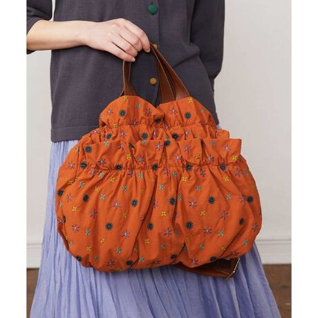 ギャザーでクシュッとさせたボリュームフォルムにカラフルなフラワー刺繍を豪華に施したショルダーバッグ。合皮素材の幅広ハンドル付きでトートバッグ使いもできる2WAYデザインです。嬉しいA4サイズも入る抜群の収納力でライトな生地感も魅力的。ショルダー部分の幅を広めにし裏側にナイロン生地を配すことで、肩にあたる部分に柔らかさを出しています。大きめサイドポケット付きで荷物の出し入れもしやすく、見た目のファッション性に加え機能性も備えたアイテムです。トートバッグ使用時はショルダーベルトを内側に入れ込むようにしていただくのがオススメです。