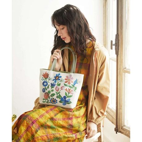 ホコモモラで人気のトートバッグの形に前後で異なる柄のプリントを施しました。表情のある型押し合皮素材に水彩タッチのフラワーが印象的。仕切りポケット付きの3ルームコンパートメント仕様で荷物の出し入れと整理がしやすい機能的なアイテム。リーフ型のファスナートップが可愛らしいアクセントに。デイリーはもちろんお出かけスタイルにも合わせやすいおすすめのバッグです。