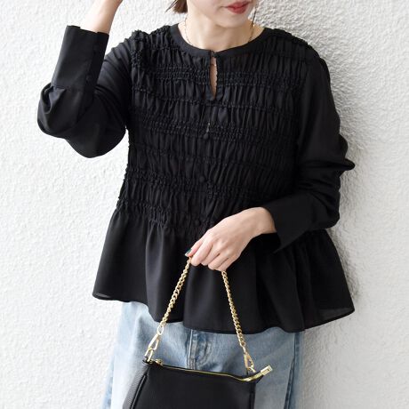 身頃部分にシャーリング加工を施した、着映えするペプラムブラウス。