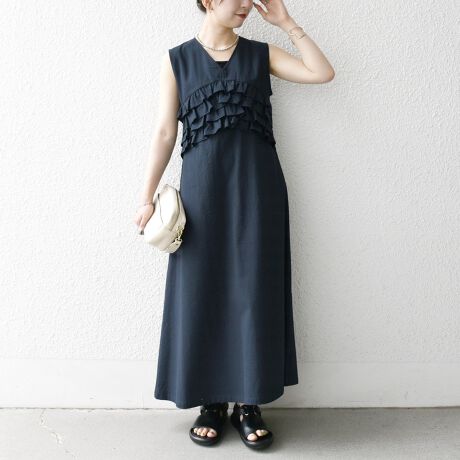 胸元にあしらったティアードフリルがフェミニンな印象のノースリーブワンピース。