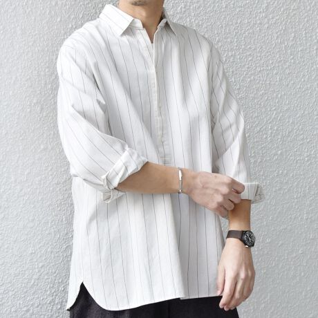 ナチュラルカラーをベースとしたシンプルなピンストライプ柄での展開なので、夏場はメイントップスとして幅広く活躍します!