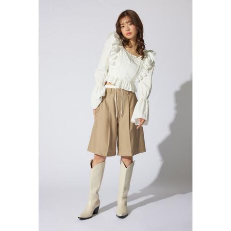 【レイヤードデザインときれいめテイストをMIXさせたハーフパンツ】■ポイントきれいめハーフパンツにレイヤードしたような、ウエストディテールのテイストMIXがトレンドライクな仕上がりに。きれいめカジュアルスタイルを簡単に叶えるハーフパンツがお目見え。ヒップから裾に向かって程よく広げることで、足を美シルエットに演出します。■ディテールレイヤードしたような、ウエストディテールがポイント。■スタイリングシンプルなトップス合わせも即おしゃれに決まります。パンツのシルエットも綺麗なので、あえてトップスをペプラムにしてハーフパンツスタイルを楽しむのも◎今年らしくロングブーツで合わせるのも良いですし、ショートブーツで合わせる時はソックスをブーツの上に少し見せて着用するとお洒落な今年らしいスタイリングに。■生地透け感:なし裏地:あり伸縮性:なし光沢感:なし厚さ:中肉■商品のお気に入り登録お気に入りアイテムの再入荷・在庫1点などの通知を受け取ることができます。[注意事項]※画像の商品はサンプルです。実際の商品と仕様、加工が若干異なる場合があります。※画像の商品は光の照射や角度、お使いのモニター環境により、実物と色味が異なる場合がございます。※着用、お取り扱いの際は、アテンションタグをご確認ください。