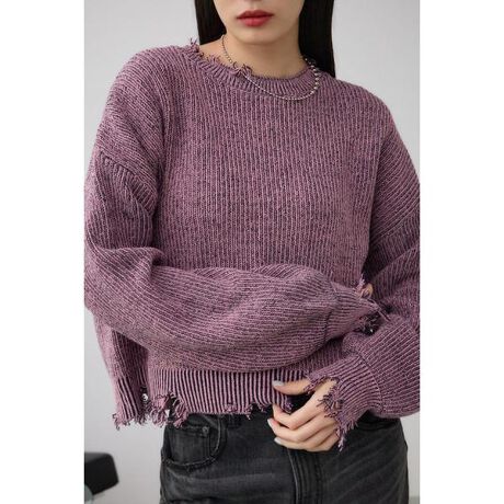 ■ダメージニットトップス■ポイントダメージデザインがポイントのニットトップス。■ディティールトレンドのショート丈とオーバーなサイズ感で、着るだけでこなれ感のあるシルエットに仕上げました。袖口と襟ぐりに施したダメージ風のデザインがポイントです。異なる2色の糸引きを揃えることで奥行きのある色味になっています。モノトーンの配色に加え、鮮やかな春カラーでアップデート。■スタイリングデニムを合わせたカジュアルなスタイルはもちろん、ナロースカート等レディライクなアイテムとも好相性です。オンオフどちらにも活躍する一着です。■生地カジュアルな風合いの綿混の素材を使用した編地です。一部配色でプレーティングして編み立てることで、配色カラーを表現したニットです。透け感:なし裏 地:なし伸縮性:あり光沢感:なし[注意事項]※画像の商品はサンプルです。実際の商品と仕様、加工が若干異なる場合があります。※画像の商品は光の照射や角度、お使いのモニター環境により、実物と色味が異なる場合がございます。※着用、お取り扱いの際は、アテンションタグをご確認ください。