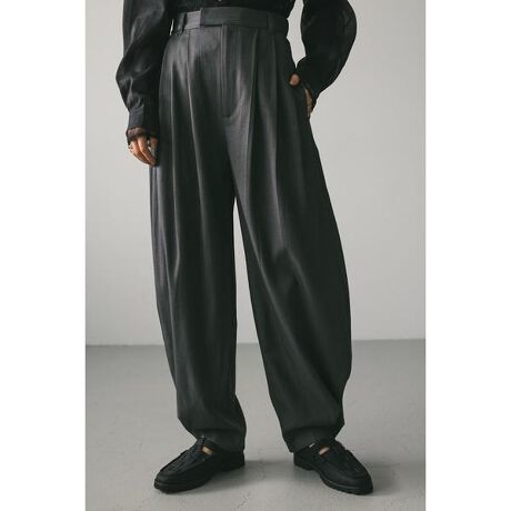 L/BEG:モデル身長162cm(Mサイズ着用)GRY:モデル身長166cm(Mサイズ着用)BLK:モデル身長164cm(Mサイズ着用)やや下目の位置で膨らみをもたせたフォルムと足元に動きが出るように施された前後の裾タックデザインにこだわったパンツ。トリプルタックでヒップ周りをしっかりとカバーしつつ、動きやすさも兼ね備えた一枚。リラックスした履き心地と品のあるカジュアルスタイルを両立してくれます。裾幅はあえて狭く設置し、足元でたるませて着るのがおすすめです。バッグサイドゴム仕様。ストレッチあり、透け感なし。【お手入れ方法】手洗い可