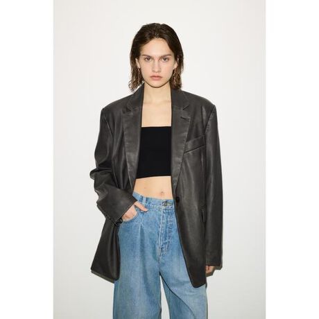 THROW by SLY【F/LEATHER BOXY JK】■POINT:長年、着古したような雰囲気のあるヴィンテージライクなテーラードジャケット。■DETAIL:程よいルーズなボクシーシルエットで、マニッシュでありながら抜け感もあるアイテム。シンプルなデザインなので、どんなスタイルにもマッチします。■STYLING:デニムスタイルはもちろん、あえてカジュアルなフーディーやスウェットパンツで抜け感を出したスタイリングもおすすめ。■FABRIC/MATERIAL:リアルレザーを思わせる程よいシボ感と、雰囲気のあるエイジング加工の質感が特徴です。■透け感:なし■光沢感:なし■伸縮性:なし■裏地:あり※本品は合成樹脂を使用しています。時間の経過と共に劣化が生じ、着用や洗濯・クリーニングの繰り返しにより徐々に硬化、剥離やひび割れ、光沢の減少等が生じます。汚れが付着したままの放置は劣化を早めますのでご注意下さい。濃色は摩擦により色移りしますのでご注意下さい。過度な摩擦や引っ張りは樹脂の剥離の原因になりますのでお避け下さい。アイロン掛けはお避け下さい。クリーニング後は、カバーを外して風通しの良い所で風乾して保管下さい。保管は高温多湿を避け、光の当たらない場所に保管し、時々陰干しして下さい。衣服間にゆとりをもって、ハンガーにかけて保管して下さい。※商品画像はサンプルのため、色味やサイズ、素材の混率等の仕様に変更がある場合がございますので、予めご了承ください。※一部予約商品につきましては生産上の都合によりお届け予定日や店頭発売と前後する場合もございます。※追加生産商品は、一部の店舗、通販で販売中の場合がございます。予めご了承下さい。