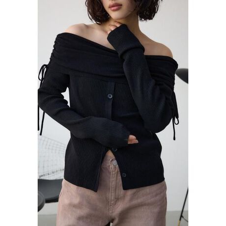 ■ギャザーオフショルダーニットトップス■ポイント折り返しのオフショルデザインがポイントのニットです。■ディティール折り返しデザインのオフショル型で、肩回りのボリュームを持たせデコルテをすっきりと見せてくれるニットです。折り返したギャザーデザインは両サイドのドロスト紐で調整していただけます。垂れたリボンデザインもポイントです。■スタイリングデニムはもちろんスカートスタイルにも相性抜群です。フロントのボタンは下側のみ開くので、インスタイルだけでなくアウトスタイルも決まります。アウトスタイルの時はお好みでボタンを開けて抜け感をプラスしてあげる着こなしがおすすめ。■生地透け感:なし裏 地:なし伸縮性:あり光沢感:なし[注意事項]※画像の商品はサンプルです。実際の商品と仕様、加工が若干異なる場合があります。※画像の商品は光の照射や角度、お使いのモニター環境により、実物と色味が異なる場合がございます。※着用、お取り扱いの際は、アテンションタグをご確認ください。