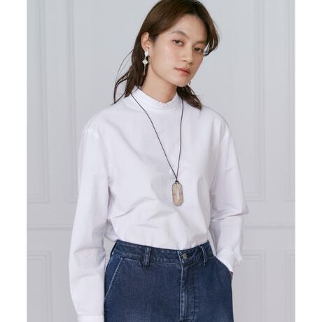 襟にプリーツを施したデザインブラウス。ボクシーなシルエットにカフス仕様のデザインで、女性らしい華奢な印象を演出してくれます。台襟付きにすることで程よくプリーツが立ち、ニットとのレイヤードスタイルも新鮮な印象に仕上がります。きちんと感とフェミニンさを併せ持ったアイテムです。・後ろファスナーあり・水洗い可■サンプル撮影商品■こちらの商品はサンプルでの撮影となっております。実際の商品とは、サイズや色味、素材、デザイン等の仕様が若干変更になる場合がございます。