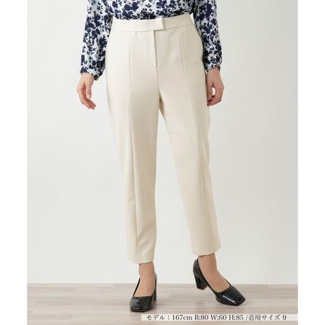シンプルながらも洗練されたデザインで、オンオフ問わず活躍するパンツです。テーパードシルエットが美しく、足をすっきりと長く見せる効果があります。センタープレスが施されており、きちんと感をプラス。ウエスト部分はすっきりとしたデザインながら、バックにゴムを採用することで快適なフィット感を実現しています。上品なアイボリーカラーが柔らかい印象を与え、ブラウスやジャケットとの相性も抜群。オフィススタイルやフォーマルなシーンにも最適な一本です。
