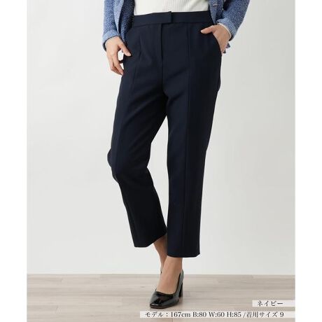 シンプルながらも洗練されたデザインで、オンオフ問わず活躍するパンツです。テーパードシルエットが美しく、足をすっきりと長く見せる効果があります。センタープレスが施されており、きちんと感をプラス。ウエスト部分はすっきりとしたデザインながら、バックにゴムを採用することで快適なフィット感を実現しています。上品なアイボリーカラーが柔らかい印象を与え、ブラウスやジャケットとの相性も抜群。オフィススタイルやフォーマルなシーンにも最適な一本です。