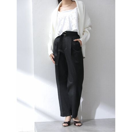 ウエストには共布のベルトを付け、タックインでメリハリのある着こなしに。