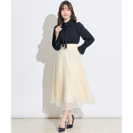 【春らしい柔らかく軽やかなムードを纏う、クロスチェックチュールスカート】【Point】・立体的に刺繍されたクロスチェックがエアリーなシアー素材に奥行きを持たせる、ソフトチュールフレアスカート。・柔らかな素材と優しげなカラーでSpring Mood満載の着こなしに仕立ててくれます。・ウエスト〜骨盤までは抑えながら、裾に向かってフワッと広がる立体的なシルエットにこだわり、ウエストギャザーの分量を細かく修正。ウエスト幅を太めに設定することで、インスタイルもすっきりと決まります。・バックレースアップで後ろ姿まで抜かりなく。ウエストを体型に合わせたぴったりサイズに調節して着用いただけます。ケア方法:ドライクリーニング透け感:あり裏地:あり伸縮性:なし(ウエスト部分:後ろゴムあり)光沢感:なし生地の厚さ:薄手
