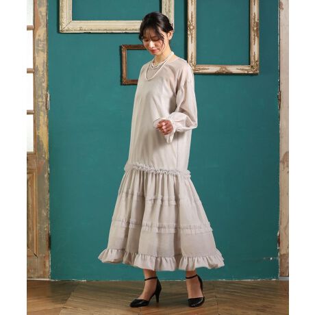 光沢あるオーガンジー素材で仕立てたデザインワンピース。
