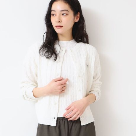 パール調ボタンと胸のロゴ刺繍がポイントのクルーネックカーディガン。