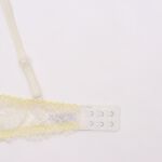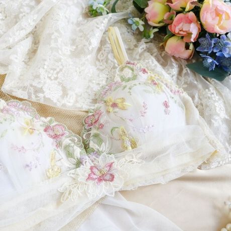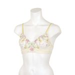 草花が風に吹かれて揺れているような印象のレースは、お花全てにラメ糸をほどこすことで、他にはない輝きを放つ豪華なデザインに仕上がりました。カップ中央にはケミカルレースとラメ糸が入ったチュールを重ねた大ぶりなアップリケを添えて、華やかさを後押し。