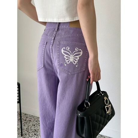 9号の人は大きめに感じるかもですが、敢えてルーズ感を出すならこちらかな?でもワンサイズ下でも充分ゆったりです。既に商品の画像が追加されていますが、後ろポケットの蝶々ははっきりした白ではなく、さりげない トーンが実際の商品です。色は綺麗なラベンダーパープルです。柔らかな色ですが前面のビジューといいラインといい、アナスイらしいロックを感じました。