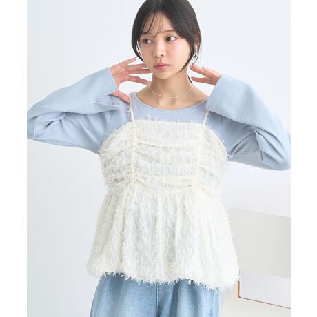 丸みのあるバルーンシルエットが女性らしいフリンジキャミソールトップス。軽やかなシフォン素材にギャザーディテールを加えることで上品なドレープ感を表現しました。甘めなデザインながらも、ニュアンスの効いたワントーンカラーがきれいめな印象に。一枚重ねるだけで、トレンドライクなレイヤードスタイルが完成するおすすめのアイテムです。透け感[なし]