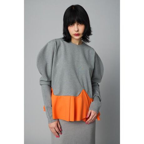 癖のあるディティールが特徴的なポンチトップス。ヘリンドットサイを代表するポンチ素材を使用した長袖トップスで、ウエストラインの切り替えにアクションを付けた一枚。立体的なバルーンスリーブで気になるに腕もカバーしつつ、ウエストラインからフレアに広がるフリルがスタイルアップをしてくれます。同素材のポンチ系ボトムスとのセットアップもオススメですが、上品にスラックス合わせなど色々なボトムスと合わせやすいアイテムです。ポンチペプラムトップス
