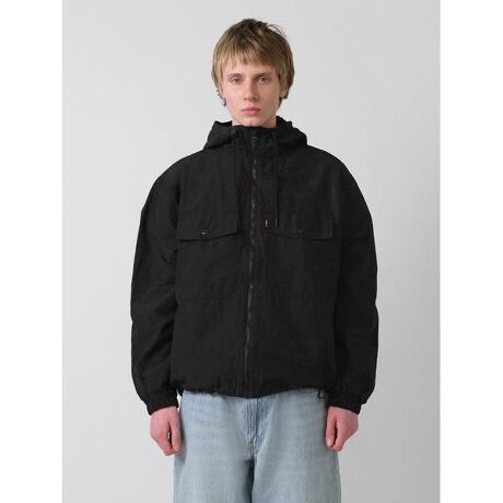 ジップアップフロント仕様のウインドブレーカー。ブラックカラーのゆったりとしたボクシーフィットのボディは、綿61%にナイロン39%を配合した生地でハリのあるが特徴です。フロントには2つのポケットを配し、裾部分はドローコード仕様なのでサイズ調整が可能です。軽く着れて、気軽に持ち運びしやすいので春先に活躍する一着です。