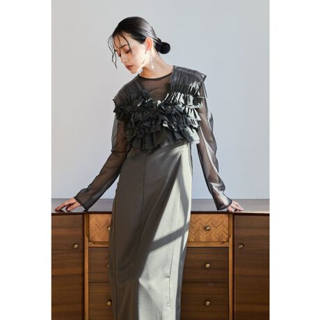 細かなフリルを重ねたタフタチュールが目を惹く華やかなオケージョンドレスです。